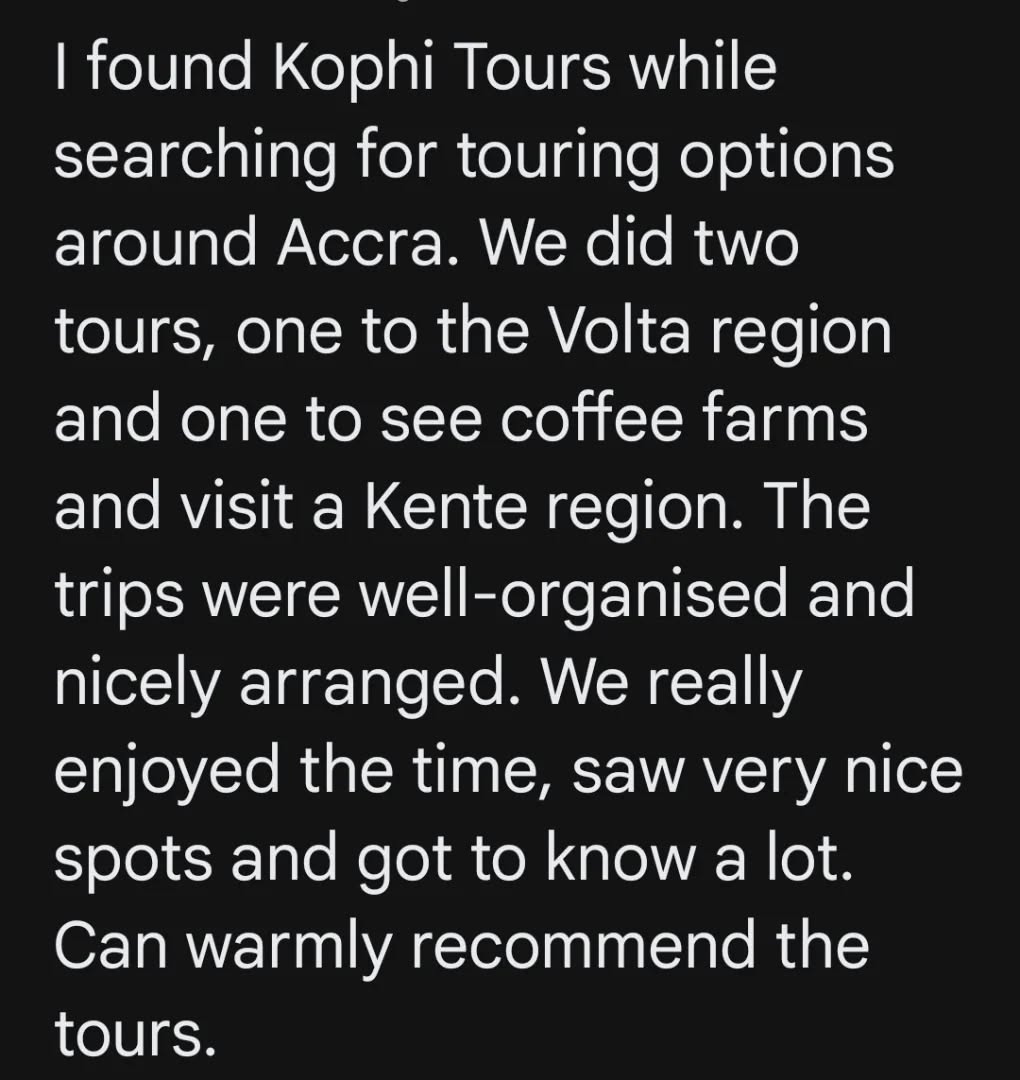 Rejoignez-nous pour un voyage qui non seulement vous satisfera mais contribuera également au développement durable des communautés locales. Laissez Guide Kophi Tours être votre compagnon de confiance pour explorer la beauté authentique et la chaleur du Ghana.